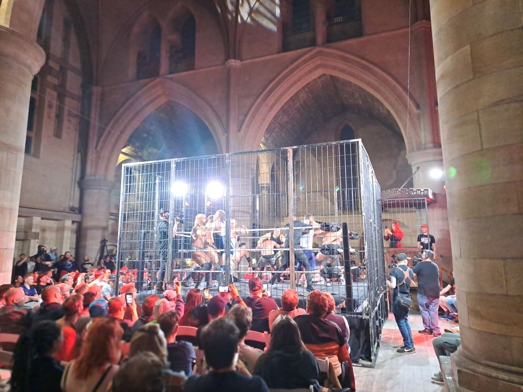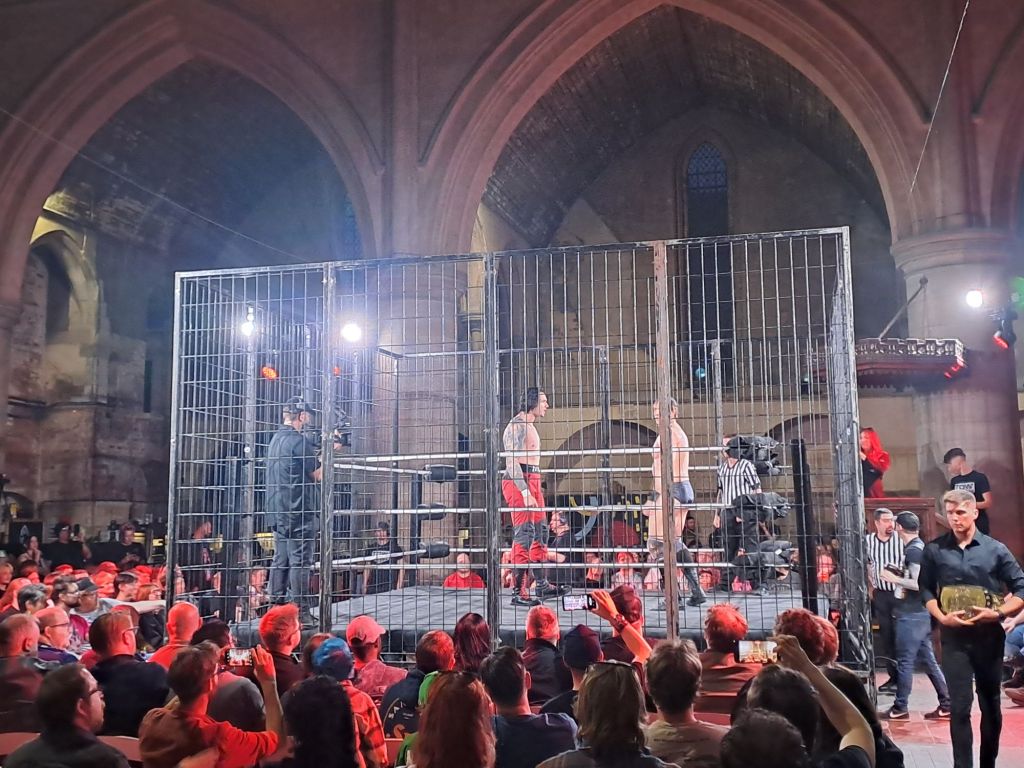 In a fantastic bit of British Wrestling, the crowd were ushered outside for Bobby Cash and NashBoat to announce the raffle while the team from Fight Factory assembled the steel cage.